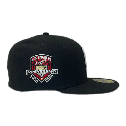 bNEW ERA LOS ANGELES DODGERS 50TH ANNIVERSARY PATCH BLACK RED EDITION 59FIFTY FITTED CAP
